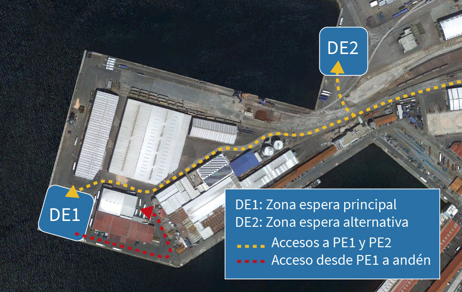Acceso a muelles de carga DART desde DE1 van a cargar por delante (muelle Comercial Sur), vial entre Marfrío a muelles de carga en Dart. (Flujo rojo).